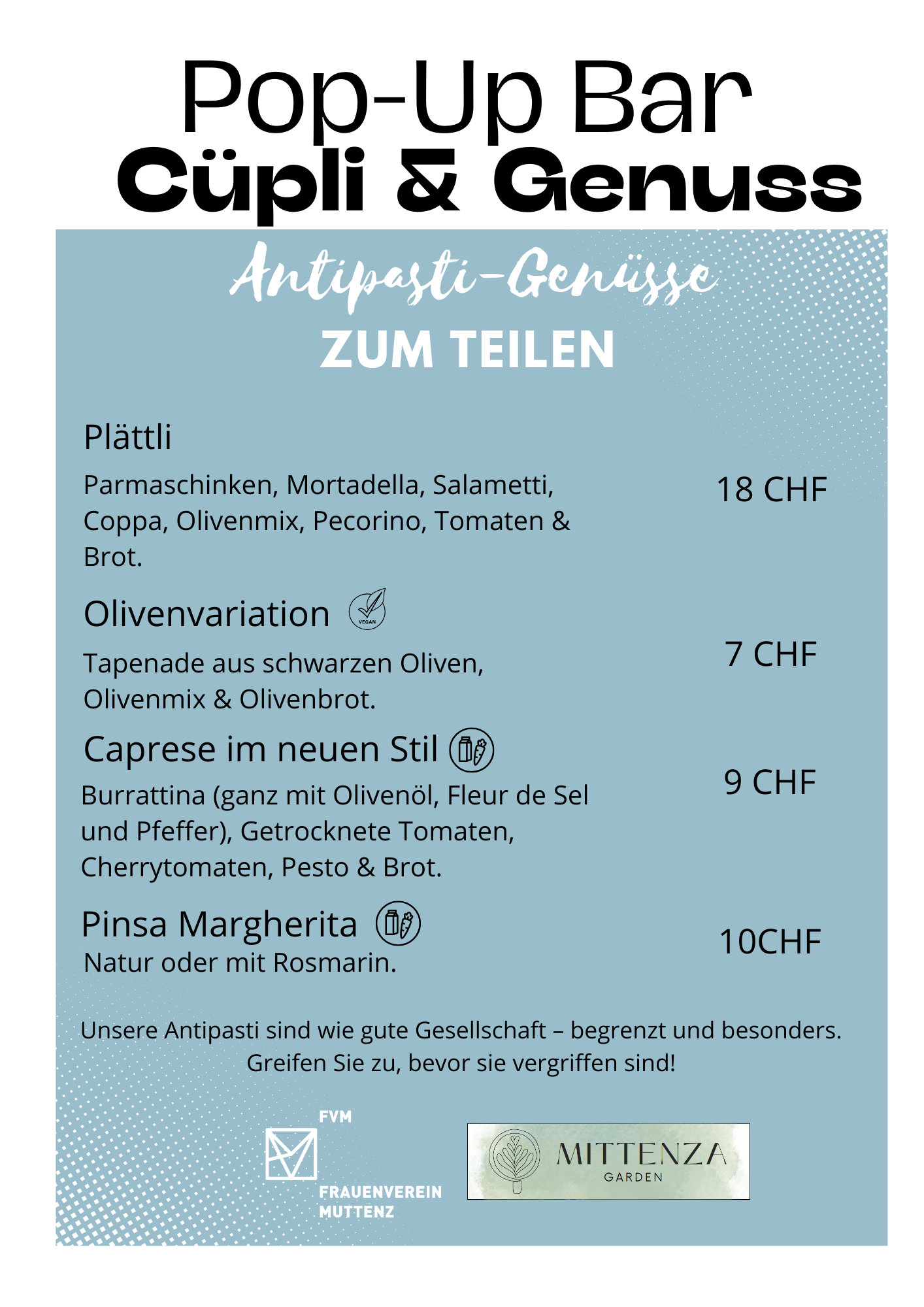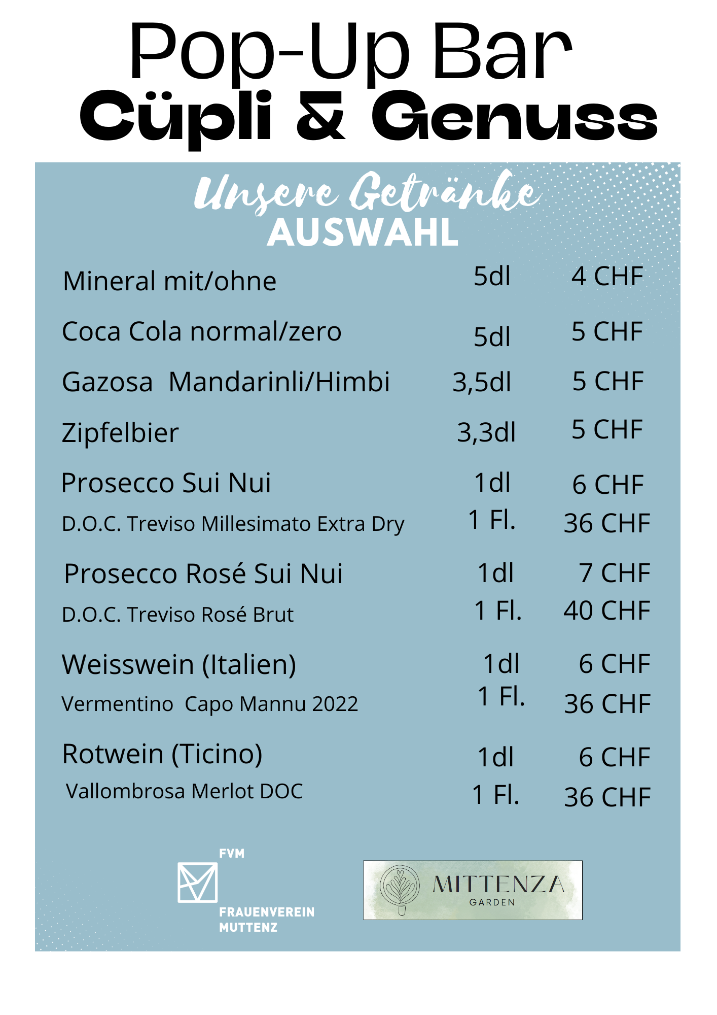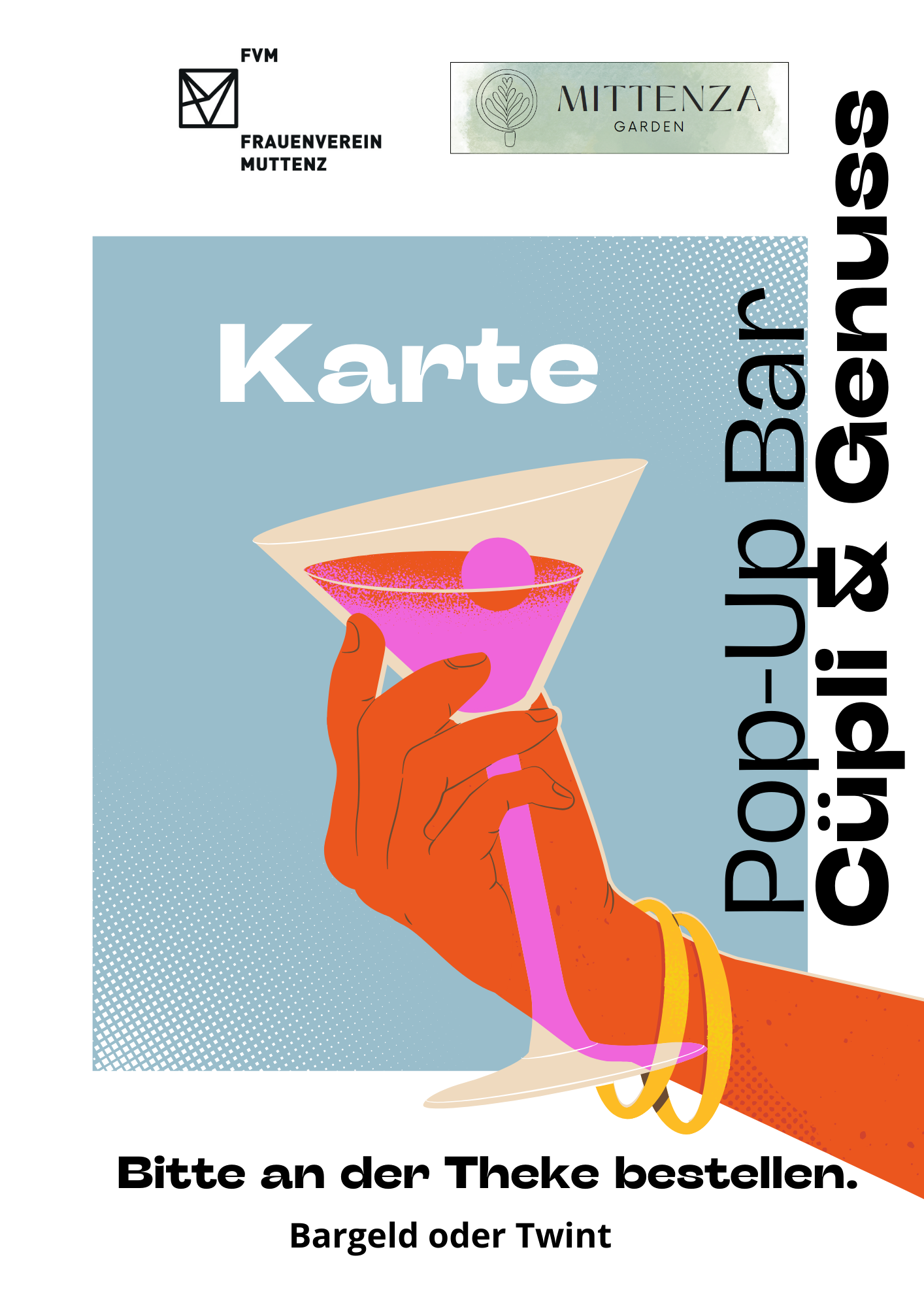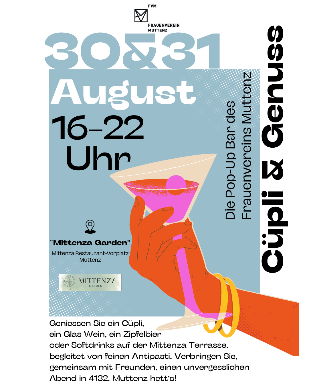 Wir freuen uns sehr, Ihnen ein ganz besonderes Event anzukündigen: Die Pop-Up Bar des Frauenvereins „Cüpli & Genuss“ findet am Freitag und Samstag, den 30. & 31. August, ab 16 bis 22 Uhr im Mittenza Garden statt!