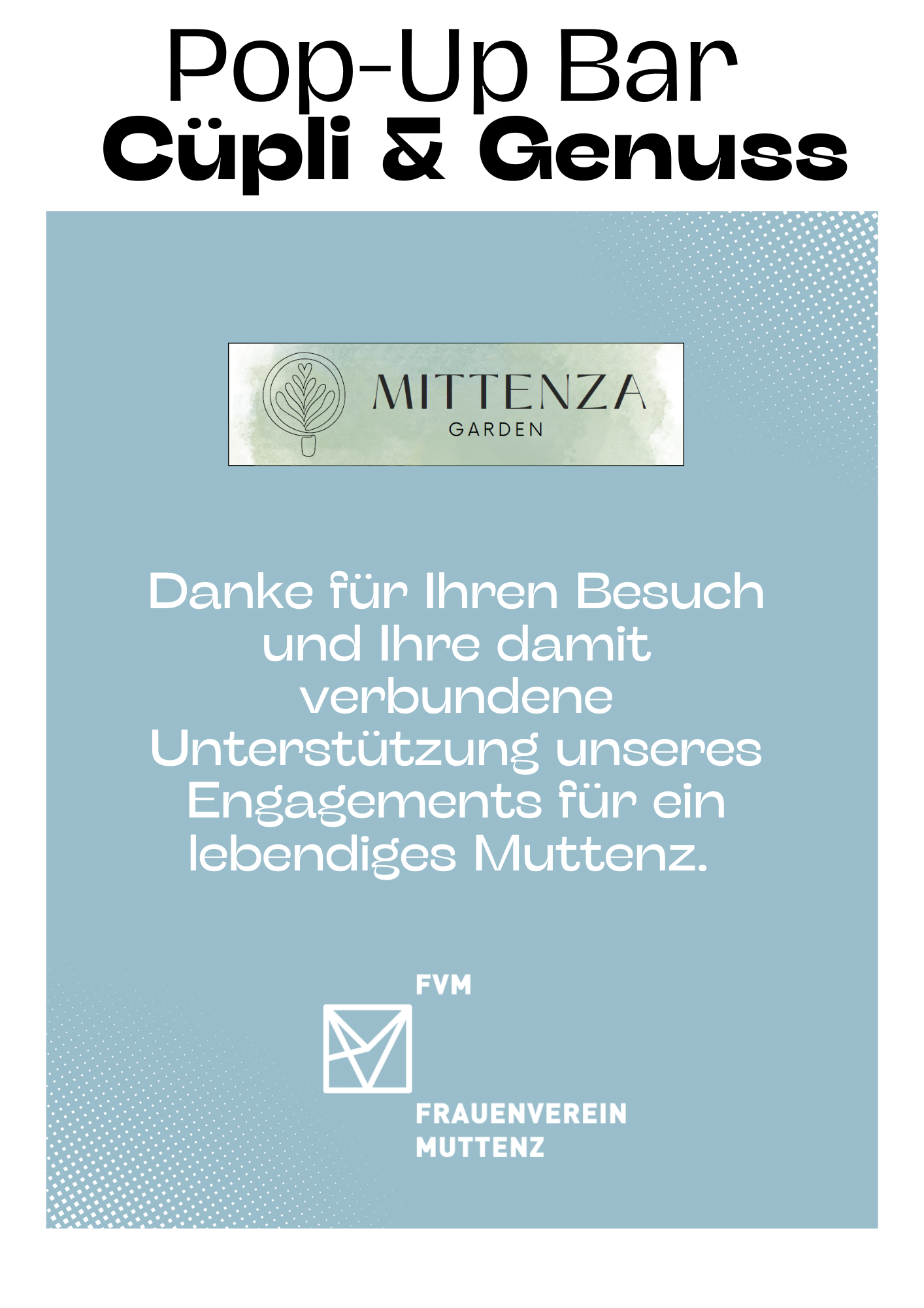 Wir würden uns sehr freuen, Sie zahlreich bei diesem einzigartigen Event begrüssen zu dürfen und gemeinsam das Engagement des Frauenvereins Muttenz für unsere lokale Gemeinschaft zu feiern. Es erwarten Sie gesellige Abende in gemütlicher Atmosphäre mit der Gelegenheit, den neuen Mittenza Garden zu entdecken.