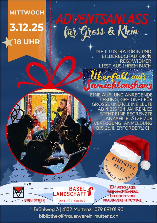 Die Illustratorin und Bilderbuchautorin Regi Widmer liest aus Ihrem Buch Überfall aufs Samichlaushaus. Zum Abschluss Weihnachtsapéro offeriert vom Frauenverein Muttenz. Zusätzlich Beleuchtung des Adventsfensters.