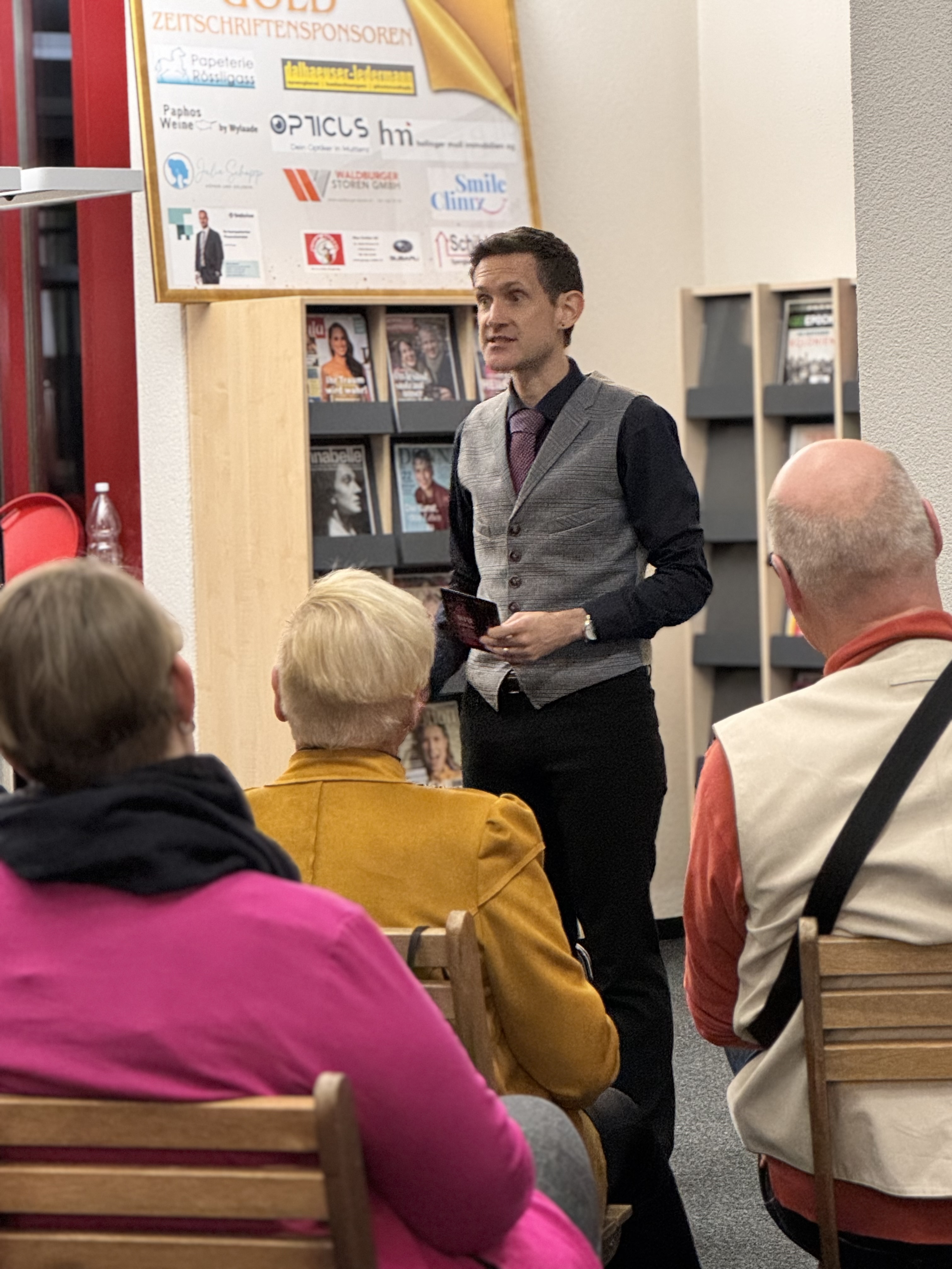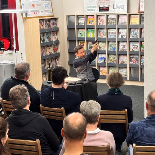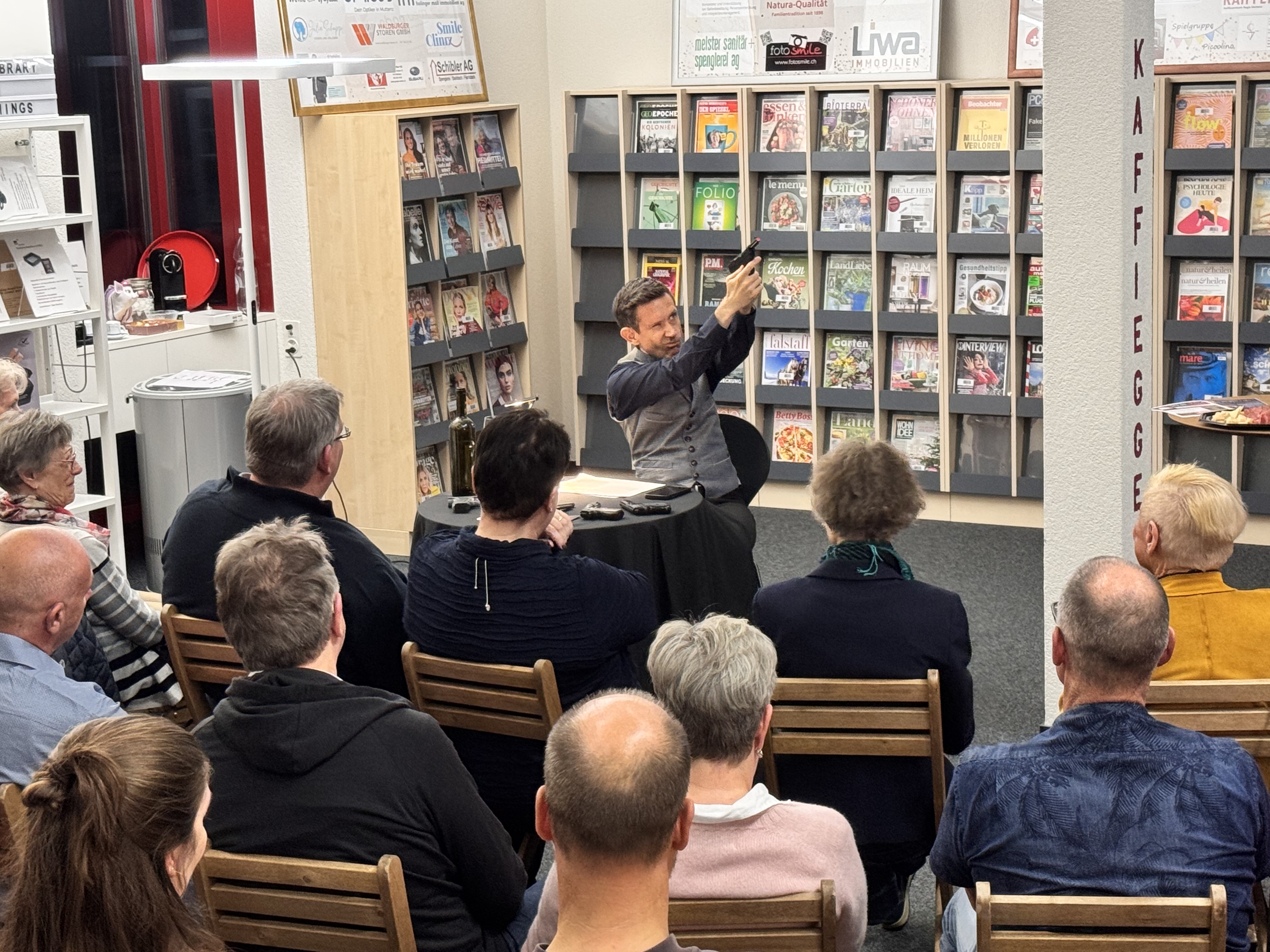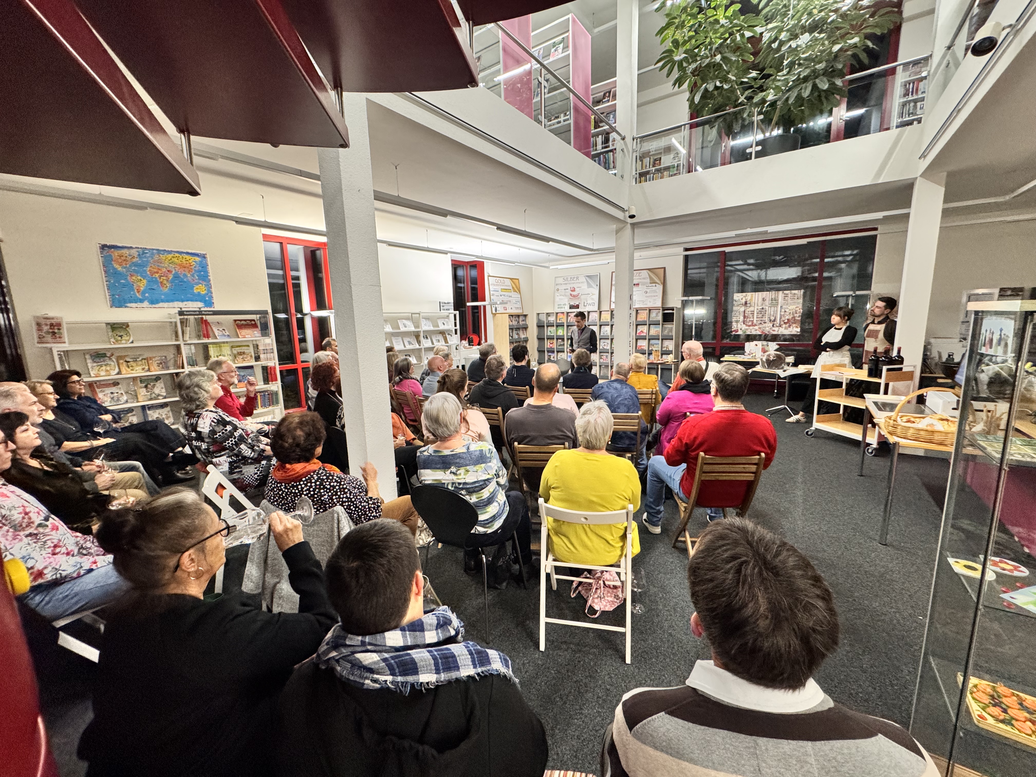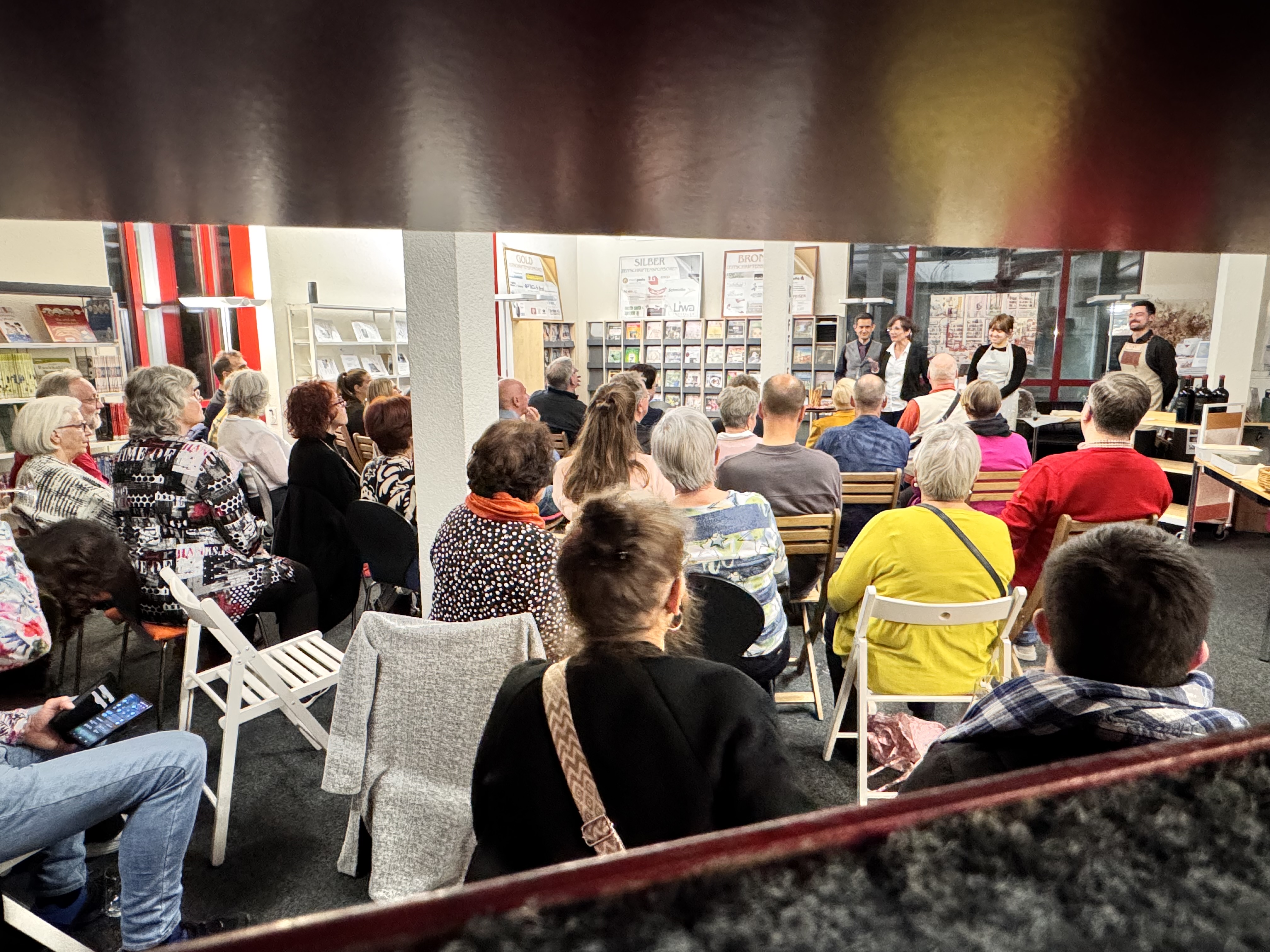 Am Freitag, 14.11.2025 fand die dritte Ausgabe von Wine & Crime mit Michael Schraner in der Bibliothek Muttenz statt. Der Andrang war gross, denn eine gute Kombination von Verbrechen und Genuss gibt es nicht so oft. Für das Publikum gab es neben spannenden Geschichten edle Tropfen vom italienischen Feinkostladen Stefanelli. Die richtige Menge Humor, genug schräge Figuren und ein guter Plot waren garantiert.